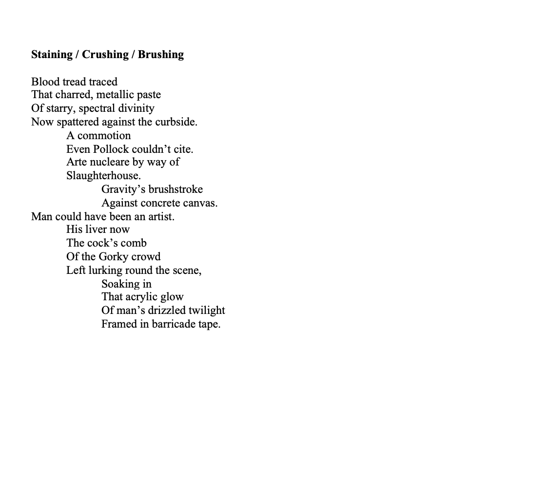 Read Poem: STAINING/CRUSHING/BRUSHING, by E.K. Gaylord III Share this: Share on X (Opens in new window) X Share on Facebook (Opens in new window) Facebook Like Loading... Author: poetryfest Submit your Poetry to the Festival. Three Options: 1) To post. 2) To have performed by an actor 3) To be made into a film. View all posts by poetryfest