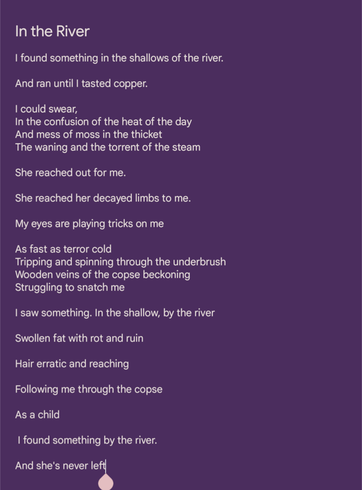 Unknown's avatarAuthor poetryfestPosted on April 26, 2025Format ImageCategories UncategorizedLeave a comment on HORROR Poem: In the River, by Bree Jensen