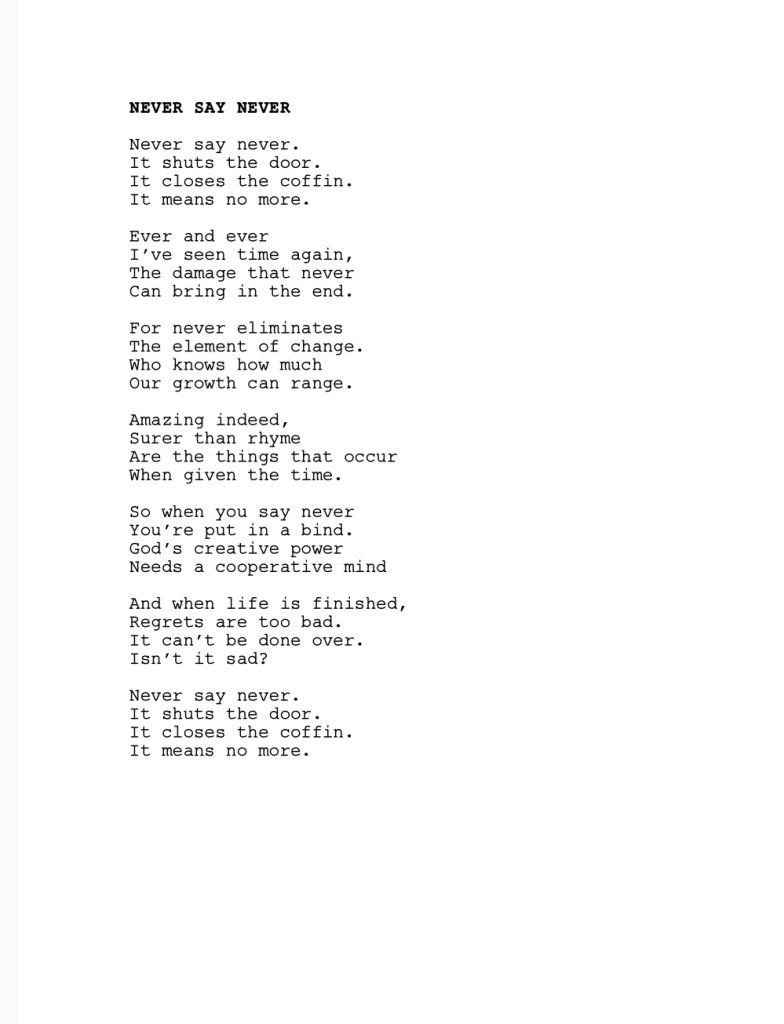 Unknown's avatarAuthor poetryfestPosted on June 21, 2021Format ImageCategories UncategorizedLeave a comment on Read Poem: NEVER SAY NEVER, by Paul Sargia